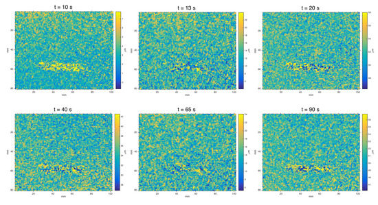 Figure 8 reports the correlation map computed by the SC algorithm for some representative frames. There is also a video ( 100 ) availaible showing the behavior of the correlation map over time (Supplementary Material, Video S1: laser speckle decorrelation maps sequence). The sequence was obtained by processing, at significant step, the pairs of specklegram , . Even if a continuous acquisition of the speckle activity is performed, one-beam speckle-intensity correlation methods require the off-line processing phase.