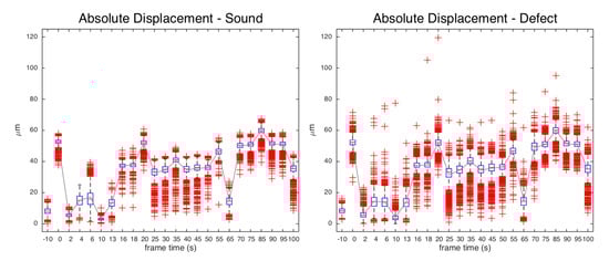 Boxplot to give an indication of the distribution of absolute displacements in defective and regular sound regions over time: −10 s, before 5 stimulus; , relaxing phase after stimulus.