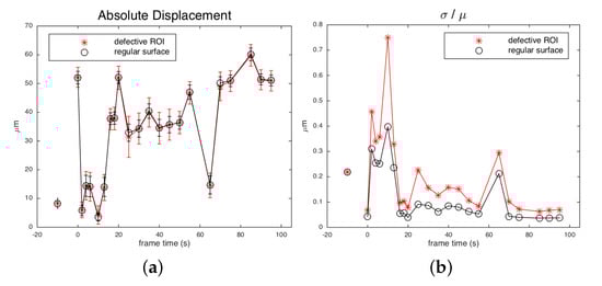 (a) Mean absolute displacement for defective and sound ROIs over time; and (b) coefficient of variation of the displacement distribution for the defective ROIs and for the regular surface over time.