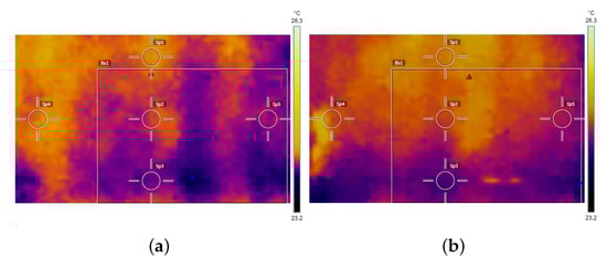 Thermal data: (a) (Sp1 = ; Sp2 = ; Sp3 = ; Sp4 = ; Sp5 = . Bx1: max = ; min = ; average = ) before and (b) (Sp1 = ; Sp2 = ; Sp3 = ; Sp4 = ; Sp5 = . Bx1: max = ; min = ; average = ) after the thermal stimulus of 5 . The box indicates the investigated ROI.