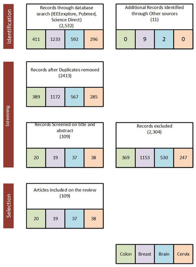 Published papers from 2016 to 2020 were considered and reviewed to (1) assess the application of deep learning for breast cancer, (2) assess the application of deep learning for cervical cancer, (3) assess the application of deep learning for a brain tumor and (4) assess the application of deep learning for colon cancer. We first defined a search criterion for the selected search databases. Our general search criteria for this survey paper are ((“colon” OR “colorectal”) AND (“cancer” OR “polyp”) AND (“deep learning”) AND (“Image”) AND (“detection” OR “classification” OR “segmentation” OR “Localization”)) OR ((“breast”) AND (“cancer” OR “mass”) AND (“deep learning”) AND (“Image”) AND (“detection” OR “classification” OR “segmentation” OR “Localization”)) OR ((“Brain”) AND (“Tumor”) AND (“deep learning”)AND (“MRI”) AND (“detection” OR “classification” OR “segmentation” OR “Localization”)) OR (“Cervix” OR “Cervical”) AND (“Deep Learning”) AND (“Classification” OR “segmentation”). The searches were carried out from four databases: (1) PubMed, (2) Science Direct, (3) IEEE Xplore Digital Library and (4) Google Scholar. The search framework of the survey paper is presented in Figure 3 and the major performance metrics used to evaluate deep learning approach applied to the selected medical images are presented in Section 2.1.