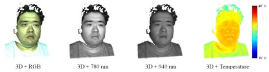 This multimodal 3D imaging system was calibrated using the method in [] in order to obtain the intrinsic and extrinsic parameters of the cameras. Based on these camera parameters, 2D and 3D image data from different imaging devices can be pixel-synchronously aligned with each other and combined into multimodal video frames. The resulting multimodal 3D video has a lateral resolution of 896 × 704 pixels. Figure 2 shows a reconstructed multimodal video frame. It can be seen that the 3D point cloud of the human face was reconstructed in high quality and high resolution despite some gaps in the hair region due to its low reflectance, and the textures in different image modalities were reasonably mapped onto the 3D point cloud without any visible alignment errors. The high-quality 3D image data in the face region ensure an accurate and robust 3D face tracking, and the fine texture mapping indicates a precise superimposition of heterogeneous multispectral and thermal image data and, thus, enables an effective analysis of these multimodal image data for vital sign estimation.
