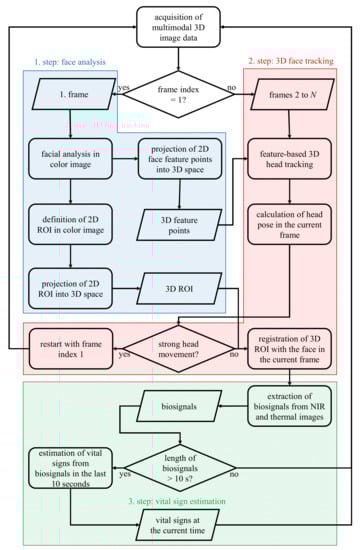 Figure 3 outlines the procedure of vital sign estimation from multimodal video data. In general, this procedure could be divided into three steps. In the first step, front face detection is performed in the color image of the first video frame. By analyzing the detected face region, several ROIs are automatically selected for the estimation of different vital signs, and at the same time, a set of feature points are detected as preparation for the face tracking in the following video frames. In the next step, the ROI and feature points are transformed into 3D space using the camera parameters obtained from camera calibration. From the second video frame, the face is tracked based on the detected features in 3D space, so the ROI can always be located at the same places on the face in each further frame. In these ROIs, different biosignals are extracted and processed. When the length of biosignals exceeds 10 s, vital signs are continuously estimated by analyzing these biosignals in the last 10 s.