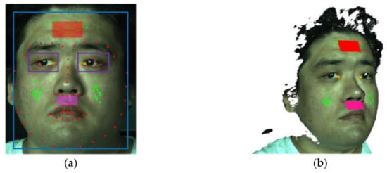 For the purpose of face tracking, a set of 2D feature points, which are shown as green points in Figure 4a, are detected in the face region using the method of Shi and Tomasi []. In the feature point detection, the previously detected eye regions are excluded from the face windows, because these regions can be influenced by the unconscious eye motions and are thus less suitable for stable face tracking. In the end, the ROI and feature points are transformed into 3D space, so that three 3D ROIs as 3D point clouds, as well as a set of 3D feature points, are generated, as shown in Figure 4b.