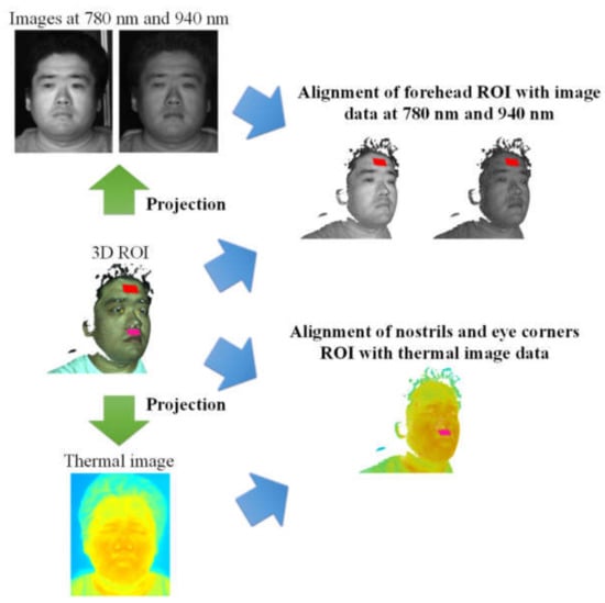 After that, the ROIs are aligned with the 3D face in the current video frame, and the 3D points of these 3D ROIs can be projected onto the images from the NIR cameras and the thermal camera in order to assign NIR and thermal grey values to these 3D ROI points. As shown in Figure 6, the forehead ROI was aligned with both the NIR images at 780 and 940 nm, while the thermal image was mapped to the nostrils and eye corners’ ROIs. For the estimation of body temperature, the mean thermal grey value of the eye corners’ ROIs was calculated and then converted to temperature values based on conversion coefficients obtained from a temperature calibration of the thermal camera.