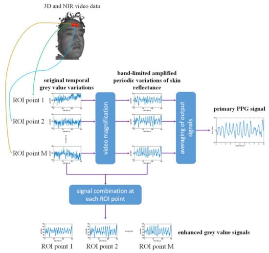 The estimation of heart rate and oxygen saturation is based on the NIR cameras at 780 and 940 nm, as well as the forehead ROI. Here, there is a challenge that the signal-to-noise ratio (SNR) of the PPG measurement is comparatively low, because the skin reflectance variation is very small and could be easily corrupted by temporal noise in the NIR cameras. An approach for the improvement of the SNR of PPG signals is the Eulerian video magnification (EVM) method [,,,,]. In this work, the EVM method is applied with some adaptations for the forehead 3D ROI to amplify the periodic variations in skin reflectance. From each 2D NIR image, a Gaussian image pyramid [] is constructed, whereby the original image is downsampled to 4 image subscales. Then, the 3D points of the forehead ROI are projected onto each sub-image of the image pyramid, and in each image scale, the spatially filtered NIR grey values are assigned to these 3D ROI points, whereby bilinear interpolation of grey values is performed, if the coordinates of projected 2D points have sub-pixel parts. As a result, each 3D ROI point has several temporal grey value variations in different image scales. For each 3D point, its grey value variations are filtered using a 128-order FIR band-pass filter with a passband between 0.66 and 4 Hz. These temporally filtered grey value variations in different image scales are then separately amplified with different factors. For the image scale with the lowest spatial resolution, the highest amplification factor is used with an empirically chosen value of α ₌ 50, and the amplification factor linearly attenuates for higher spatial resolutions, until α ₌ 0 is reached at the highest image subscale. In the end, an output signal presenting the amplified periodic variation of skin reflectance is constructed for each 3D point by linearly combining the grey value variations that are separately filtered and amplified in each image scale.