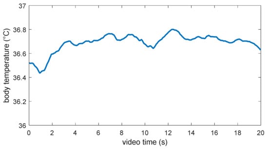 Figure 8 shows the variation in estimated body temperature from the eye corners’ ROIs within 20 s. The estimated temperature value varies between 36.4 °C and 36.8 °C and appears to be reasonable with regard to the standard body temperature. The minor fluctuation may be due to the influences of air flow and the variation in the distance between eye corners and thermal cameras as a result of head motion.