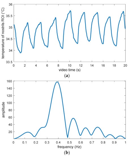 The results of respiration rate estimation are shown in Figure 9. Figure 9a shows the variation in the mean temperature of the nostrils’ ROI within 20 s. Here, an obvious periodic variation in the ROI temperature value within the range between about 34 °C and 35 °C can be seen, while the temperature contrast due to inhalation and exhalation is about 1 °C. Considering that the thermal camera exhibits a temperature resolution of about 0.05 °C, the temperature contrast in the signal can ensure a robust estimation of respiration rate against camera noise, if there is no disturbing air flow from any external source. Figure 9b shows the power density spectrum calculated from the first 10 s of this temperature signal. It presents a significant and unambiguous peak, which should correspond to the respiration rate and exhibits a frequency of about 0.39 Hz, namely 23.4 breaths per minute.