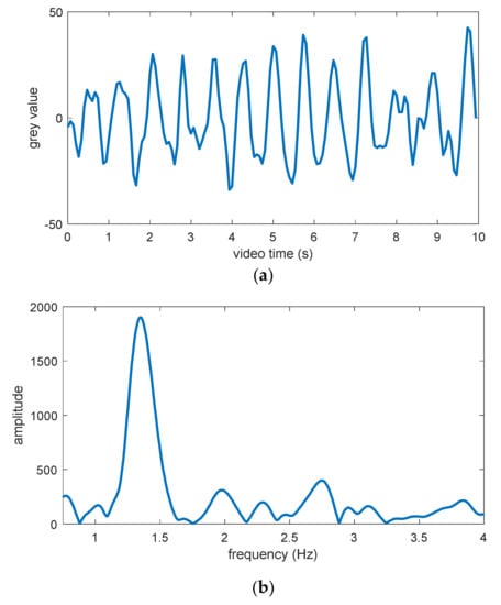 Figure 10 shows an example of the final PPG signal extracted from the forehead ROI and the power density spectrum calculated from this PPG signal. In this power density spectrum, an obvious peak can also be found. This peak has a frequency of approximately 1.32 Hz, corresponding to a heart rate of 79 beats per minute (bpm). This value is exactly in accordance with the ground truth value at this time point. Furthermore, in Figure 11a, the variations in estimated heart rate and ground truth heart rate within 80 s are compared with each other. It can be seen that both these variations coincide with each other well at most of the time points, except in the time range between 15 and 21 s, as well as between 33 and 49 s. It is observed that the breath of the test subject was held during both these time ranges. This action probably had certain negative influences on the heart rate estimation based on PPG measurement.