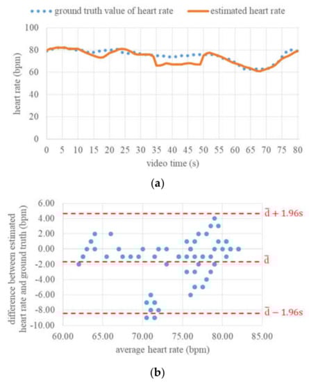 Overall, the mean absolute deviation in estimated heart rate from the pulse oximeter across all video frames was 2.56 bpm, while the maximal absolute deviation was 9 bpm. Moreover, the agreement between the contactless heart rate estimation and the pulse oximeter was assessed using the method proposed by Bland and Altman []. For this, the differences between estimated vital sign values and their ground truth values were determined. Then, the mean differenceand the standard deviation of the differenceswere calculated to determine the interval of agreement. For a confidence level of 95%, the limits of agreement (LoA) were and. As shown in Figure 11b, the mean heart rate difference was −1.89 bpm, and the LoA ranged from −8.41 up to 4.63 bpm. This negative bias was due to the obviously underestimated heart rate values in both the time ranges mentioned above, but nevertheless, these values indicate that the heart rate estimation algorithm can in general deliver reasonable estimation values in the case of continuous long-time monitoring.