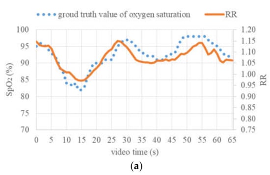 The estimation of oxygen saturation begins with the extraction of the pulsatile (AC) and nonpulsatile (DC) components of blood flow at two different channels of the color camera. These AC and DC components can be calculated either from extracted PPG signals [,,] or directly from video data [,,]. Thereafter, the so-called “ratio of ratios” (RR), namely the ratio between the AC-to-DC ratios that are calculated at two different wavelengths, can be determined. Theoretically, this value is linear to the value of oxygen saturation, whereby the coefficients of this RR-to-SpO2 conversion are to be empirically determined.
