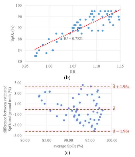 Figure 12a shows the variations in ground truth SpO2 values and calculated RR values within 65 s. Both these variations are qualitatively consistent with each other in the course of time, and the Pearson moment correlation coefficient between them is 0.867. In Figure 12b, the result of the linear regression between RR and SpO2 values is shown. In general, a linear relation can be found and the prediction of SpO2 values based on RR is possible, though the data appear to be somewhat noisy and the coefficient of determination R2 of the linear statistical model is 0.7521. Based on SpO2 values estimated from the RR values using this linear model, the limits of agreement were determined according to the Bland–Altman method and are shown in Figure 12c. Here, the mean difference was zero, because the same ground truth values used for the fitting of the linear RR-to-SpO2 conversion model were also used for the determination of LoAs, and the 95% confidence LoAs were −4.26% and 4.26%. Based on Figure 12a and the LoAs, it can be claimed that changes in the SpO2 values by more than 5% could be detected with high reliability.