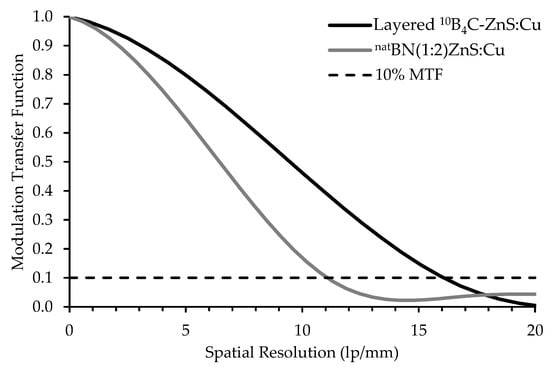 | Converter Material | Converter to Scintillator Atomic Ratio (Boron atom to ZnS:Cu) | Resolution at 10% Modulation Transfer Function (MTF) (lp/mm) |