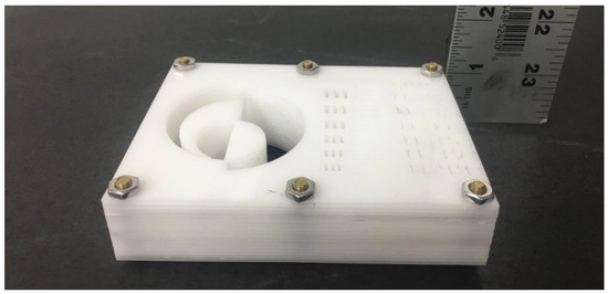 An imaging phantom object was fabricated from a stack of patterned Delrin® [Polyoxymethylene, (CH2O)n] sheets with a combined thickness of 25 mm. The sheets were fabricated using a Computer Numerically Controlled (CNC) milling machine patterned with a USAF-1951-compliant resolution chart consisting of different sized vertically and horizontally oriented groups of three bars of equal width and separation. The object also contained six bolt holes which aligned the sheets with respect to each other. The imaging phantom is shown in Figure 1.