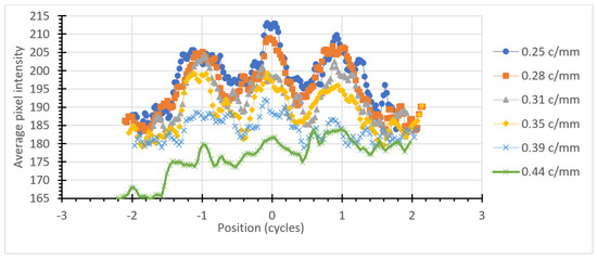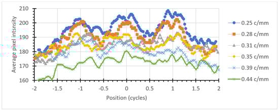 By averaging the pixel values across each x or y direction, a graph of the average intensity may be constructed. Plotting these on a graph as a function of position in the cycle, rather than absolute distance, allows the three intensity peaks to line up for different line pair spacings in the pattern. This is shown in Figure 5 and Figure 6 for horizontal and vertical bars, respectively.
