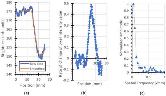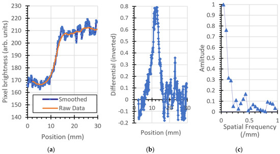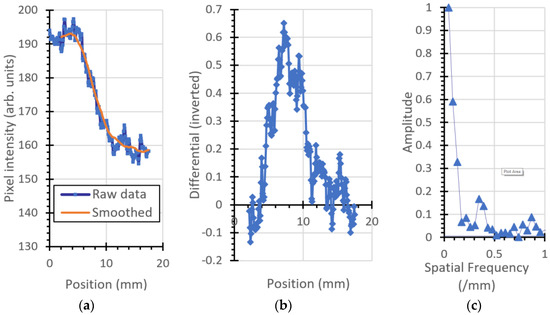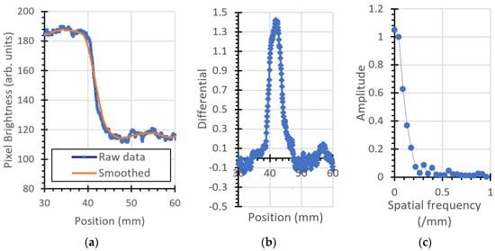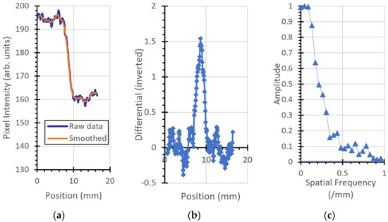 Vertical left edge of the plastic phantom: (a) ESF, (b) LSF (inverted for clarity), and (c) MTF.