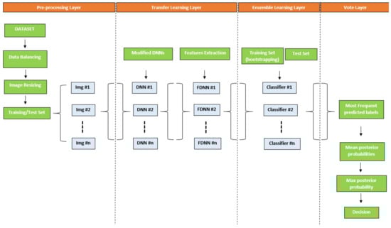 In this section, we describe the proposed framework which includes two well known methodologies: deep neural network and ensemble learning. The main idea is to combine algorithms of features extraction and classification. The result is a set of competitive models providing a range of confidential decisions useful for making choices during classification. The framework is composed of three levels. A first, which performs preprocessing operations such as image resize and data balancing. A second, of transfer learning, which extracts features using deep neural networks. A third level, of ensemble learning, in which different classification algorithms (SVM [29], Logistic Label Propagation (LLP) [30], KNN [31]) and features extracted are combined with the aim of making the best decision. Adopted classifiers are trained and tested through a bootstrapping policy. Finally, the framework iterates through a predetermined number of times in a supervised learning context. Figure 1 shows a graphic overview of the proposed framework.