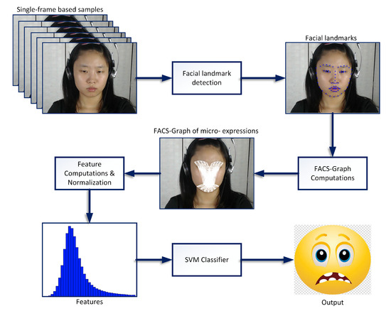 Although the aforementioned methods demonstrate notable improvements in ME accuracy, the high computational cost and requirements for pre-defined spotting of onset and offset frames renders these methods impractical as a real-time solution. Looking into macro-expression detection and recognition, References [16,17,18] suggested that geometric features are more robust in spotting the changes in face components, in comparison to the appearance based features using LPB-TOP, HOG and HOOF. However, to the best of our knowledge, very few articles utilize the geometric features for ME recognition based on single-frame sample. Existing geometric-based feature extraction algorithms yield poor ME recognition accuracy. This is due to the fact that geometric approach require large number of features [19]. However, since some of the existing ME datesets are FACS-coded. This suggests that the geometric features based on FACS could improve the recognition accuracy challenges. Therefore, this paper puts forward a geometric-based feature extraction technique using FACS for ME recognition with facial landmarks. The proposed method here addresses both the accuracy and computational cost for real-time ME. Crucially, the proposed technique processes ME recognition on frame-based samples, which substantially increases its feasibility in processing video of high frame rates. It computes features using facial landmarks extracted from the pre-processing stage of any input frame. This in turn substantially reduces the computational complexity in processing high frame rate video while at the same time improves the ME recognition accuracy further in comparison to the latest published article using the same validation technique [15].