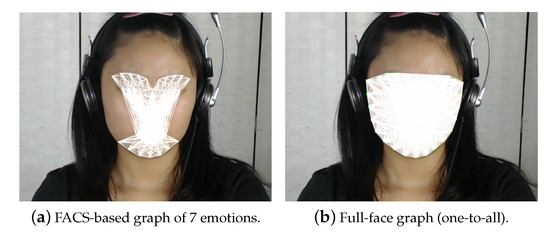 On the other hand, Equations (1)–(3) express the FACS-based graph computation using the facial landmarks. Firstly, Equation (1) groups the AU codes based on FACS by computing the landmark coordinates of every connecting points of facial components defined within the AU region, where represent the first connecting point and represent the second connecting point. Then, Equation (2) combines the AUs codes defined from Equation (1) to generate graphs for every emotion (denoted as ), where R represents the number of AUs for per emotion. While, Equation (3) groups the generated graphs of all the seven emotions computed using Equation (2) to form the combined graph (denoted as ), where K represents the total number of emotions considered in this work. Equation (4) deletes the repeated segments within the combined graph (i.e., ) in order to produce the final FACS-based graph (denoted as ). Total number of segments computed from Equation (3) is 3083. Then, after removing the repeated segments using Equation (4), the new total number of segments is reduced to 1178.