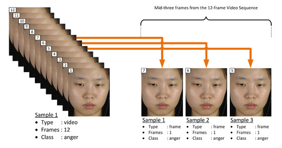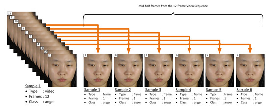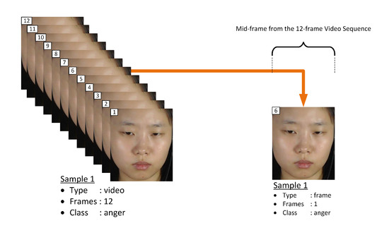 This experiment selects only the mid-frame and present it as the only input frame from each video, this process is expressed in Equation (5). As suggested in Reference [40], the mid-frame within each video sequence will have a significant change in comparison to the first (i.e., onset) and last (i.e., offset) frames, and therefore considered as the input frame to represent the video sample in this experimental setup. Figure 4 illustrates the selection of a sample from a 12-frame video sequence for Experiment I setup.