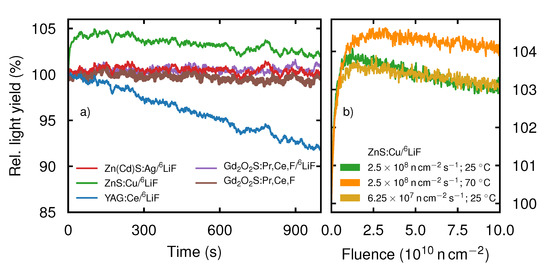 Figure 2. (a) Time-dependent light yield of the five scintillation screens during the first 1000 s of neutron irradiation relative to their respective light yield at time t i = 0   s . (b) Change of the fluence-dependent light yield of ZnS upon change of the neutron flux or the temperature of the scintillation screen, respectively. The curves were adjusted for time-dependent neutron flux variations and normalized to the respective light yield at t i = 0   s .