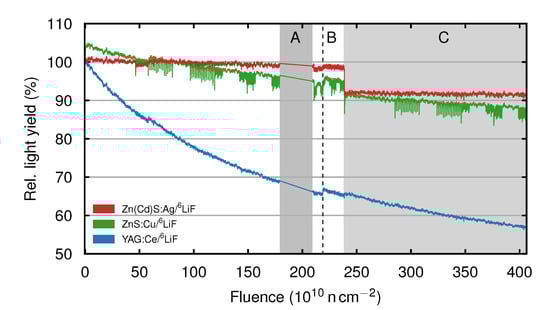 Figure 3. Light yield of ZnS (green), ZnCd (red) and YAG (blue) relative to their respective light yield at t i = 0   s dependent on the total deposited neutron fluence. In area A, the screens were exposed to a total neutron fluence of 3 × 10 11 n cm−2, but no measurements were performed. The dashed line B denotes a pause of 12 h were the 6LiF-based screens were not exposed to neutrons. During this pause, we measured the Gd-based scintillation screens. The scintillation screens were heated to 70 °C during the fluence deposition in area C.