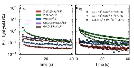 The resulting data are presented in Figure 2a. The light yield of every scintillation screen was normalized to its respective light yield at t i .