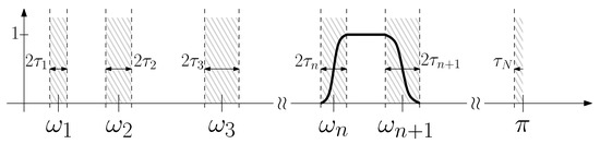 As such, to detect the expected partition of the Fourier domain, we compute the scale-space representation of the signal magnitude spectrum, i.e., we set , to extract the meaningful minima, which will correspond to the set of expected boundaries . In the 2D extensions described in Section 2.2, detecting 2D partitions resumes in performing multiple 1D detections (by averaging the 2D Fourier spectrum or pseudo-polar Fourier spectrum with respect each dimension) because of their specific structures. We invite the reader to check [14,15] and especially [22] for more details and numerical implementations.