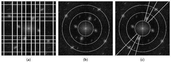 Examples of 2D EWT Implementations: In order from left to right, we see the partitioning of the Fourier spectrum of the (a) Tensor, (b) Littlewood–Paley, and (c) Curvelet (Option 1) empirical wavelet transforms.