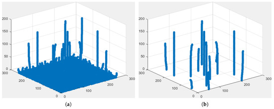 Tracking of Maxima through Scale-Space (the vertical axis corresponds to the scale s): (a) shows all maxima through scale-space. (b) shows the remaining persistent maxima, i.e., of lifespan larger than the threshold defined by Otsu’s method.