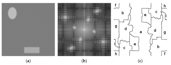 First, we show how the EWWT decomposes a toy image, which is made of four well separated harmonic modes and two slightly blurred piecewise constant components. This toy image is illustrated in Figure 6a along with its magnitude spectrum in Figure 6b. Figure 6c provides the detected partition and Figure 7 shows the empirical watershed wavelet coefficients obtained by performing the transform. As expected, the EWWT is capable of isolating the five harmonic modes present in the original image, which are depicted in Figure 7a–e. As for the other coefficients shown in Figure 7f–i, we see very little information (as per their respective norms), which mostly consists of high frequency information near the piecewise regions. Looking at the Fourier partition, we see that these extra coefficients correspond to regions near the edge of the spectrum where the Fourier coefficients are very small.
