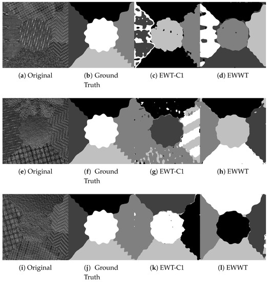 To perform the unsupervised texture segmentation of an image, we go through the following steps, which are outlined in detail in [16]. First, we perform a cartoon–texture decomposition of the image and keep only the textural part. This removes some variability in lighting and other non-textural information. Next, we perform the empirical wavelet feature extraction, which in our case, is either the EWWT or the EWT-Curvelet 1 option. Afterwards, we perform an energy aggregation method by calculating the energy on a window centered at each pixel. The ideal window size is mostly dependent on the dataset, and [16] shows that a window is best for the Outex dataset. The final segmentation is obtained by performing a pixel-wise k-means (the expected number of textures k is provided to the algorithm) clustering with cityblock distance.