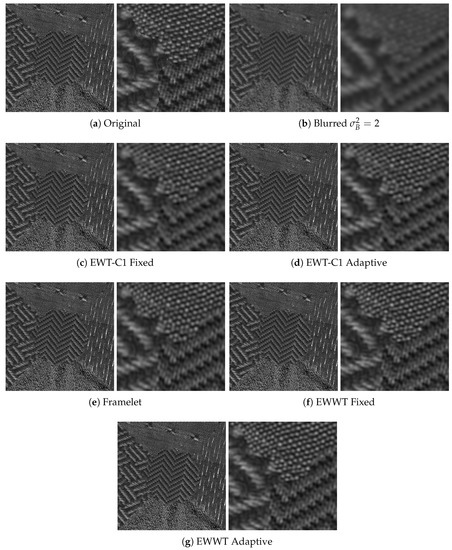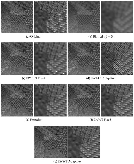 For both empirical wavelet approaches, we look into both the fixed filter bank approach and the adaptive filter bank method described in Section 4.3.2. The primal-dual algorithm has its own parameters set to , , , and [39]. The results (again averaged on 50 images) are shown for all values in Table 7, while visual deblurring examples are shown in Figure 9 and Figure 10.