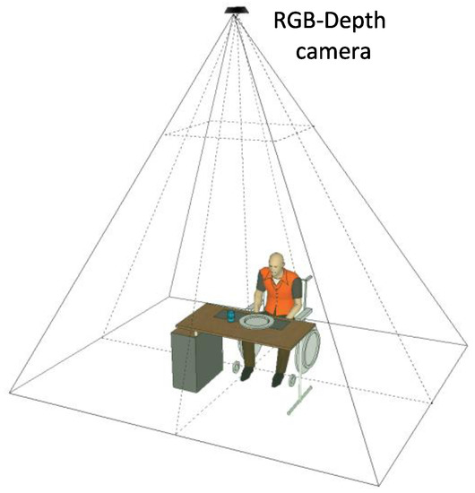 The food intake detection algorithm considered here relies on an unobtrusive method, in which a Kinect v1 device is placed on the ceiling of the two closed rooms with the aim to reproduce the same set-up in a domestic environment, avoiding the acquisition of the subjects’ faces and preserving their privacy. In order to evaluate the algorithm performance, many tests were performed by seven subjects (two females and five males) with varying durations, table positions and the person’s upper part of the body orientation with respect to the table. The subjects taking part to the tests were between 22 and 52 years old, with heights in the range of 1.62 to 1.97 m. The experimental set-up is shown in Figure 1.