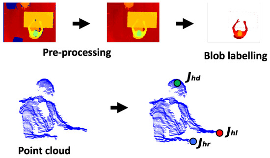 The point cloud (PC) extraction process and identification of the input model principal joints: is the center of the head joint, is the right hand joint and is the left hand joint.