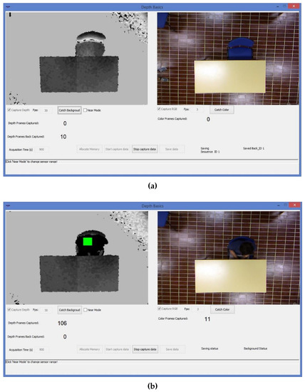 The first step is related to the development of a software that is able to speed up the processes of continuous depth and RGB data acquisition and storage. Figure 4a,b show the software interface in cases of “background” and “person in the scene” acquisitions respectively.