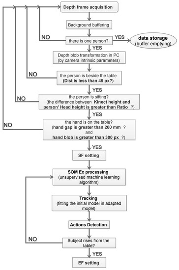 The SOM Ex algorithm is used to trigger data storage by recognizing the moment that the subject is seated with one hand on the table. The functionality to extract the start frame (SF) is introduced in order to identify the initial frame that a person sits at a table, using a low-complexity and instantaneous person detection algorithm. The approach is based on a series of events checks; if one of these does not occur, it is not possible to proceed with the next step. The checklist is:
