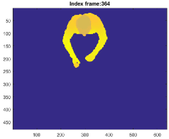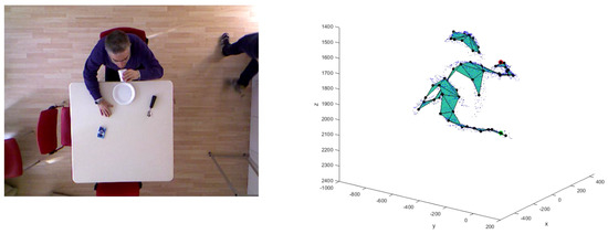 Taking into consideration the anthropometric measures of the subject under test that constitute the adaptive model, the post-processing functions trigger the calculation of the Euclidean distances between head and hands joints and checks that they remain separated. The control consists of introduction of thresholds and a reset mechanism. In particular, if the and (or ) shows a Euclidean distance which is less than 300 pixels, for more than five seconds (threshold-time corresponding to 150 frame, because the processing frame rate of 30 fps), a reset mechanism restores the initial model which fits the subject’ current movement instantly. The 300 pixel value corresponds to about 200 mm and was empirically determined by measuring hand and mouth distance from the ground-truth, which is represented by the RGB frames. We set experimentally these thresholds considering the situations consistent with a normal drinking phase, which is longer than a food intake action.