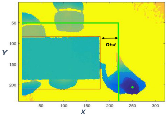 By defining “Dist” (= 45 pixel) as the range of the coordinates (x, y) of a box around the table (Figure 7), the first control is the position of the person to ensure that the subject is beside the table. If the distance between the person and the box is greater than “Dist”, the algorithm does not proceed to the next control.