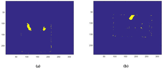 Figure 9. (a) The blob of both hands are extracted; (b) only one hand’s blob of the person sitting is extracted.