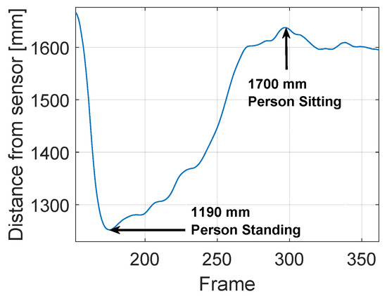 The point in the minimum peak of 1190 mm indicates the person standing identification with minimum person’s distance from the sensor. The frame in which the person change his/her position from standing to sitting, with a consequent increase in the person’s distance from the sensor, is indicated in the maximum peak of 1700 mm. The is calculated as 30% less than 1700 mm, that is 1190 mm.