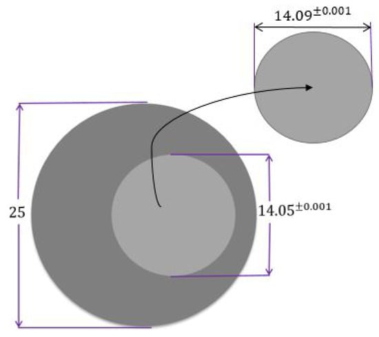 We now test the algorithm on experimental data for an offset ring-and-plug sample, which was used previously [24]. The sample geometry of the offset ring-and-plug is shown in Figure 5. The described sample contained a total interference of m produced through cylindrical grinding. More details about the sample can be found in [24]. A steel bar ENmathsizesmall26 was heated to relieve stress and provide a uniform structure prior to the assembly. The final hardness of the sample was 290 HV. The strain profile was measured on RADEN together with an MCP detector at a distance of 17.9 m from the source of the beam. RADEN is an energy-resolved neutron imaging instrument at the Japan Proton Accelerator Research Complex (J-PARC), Japan, [15,16] was used to obtain the relative shifts of the Bragg edge corresponding to the lattice plane of the offset ring-and-plug steel sample. Neutron strain scanning was carried out on KOWARI, a residual stress diffractometer at the Australian Nuclear Society and Technology Organisation (ANSTO), Australia to provide independent validation of our reconstruction. Sampling times on KOWARI were based on providing uncertainty in strain around , which required around 30 h of beamtime per component. However, sampling times on RADEN were based on statistical uncertainty of the order . In total, 50 profiles were measured at golden angle increments in with a sampling time of 2 h per projection.