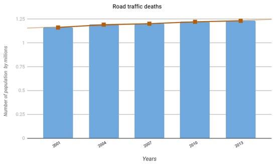 The World Health Organization (WHO) has identified road traffic injuries as a major global public health problem. As indicated in the World Road Safety Status Report 2015 [], they are one of the major causes of death and injury. Each year, nearly million persons die, and millions more are injured or handicapped as a result of road traffic accidents. Figure 1 shows the upward trend in the number of road deaths between 2001 and 2013.