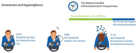 A study conducted in Morocco [] in 2013 demonstrated a worrying number of accidents identified with drowsiness, which is responsible every year for more than 4000 deaths and 1.4 billion dollars of material harm. Early drowsiness accounted for 36.8% of cases, and drowsiness was accounted for in 31.1% of cases, including the quarter of the month preceding the survey. Likewise, 42.4% of drivers did not meet the suggested break each 500 km or 2 h of driving in Figure 2.
