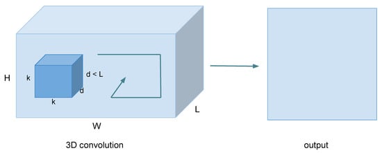 3D convolution operations; the three directions represent the calculation of a convolution. The output shape represents a 3D Volume; input = and filter = ; then, output = , and most importantly, for obtaining output volume.