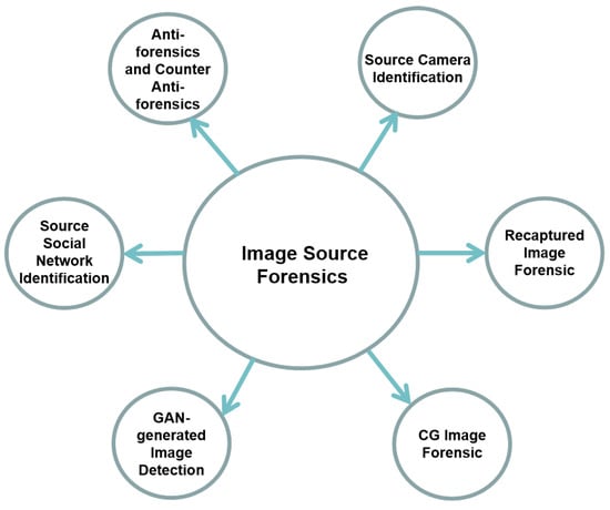 In order to verify the authenticity and integrity of a digital image, a number of techniques, known collectively as “digital image forensics” [], were developed during the last years. Within this research area, source image forensics tries to answer the general question “where is this digital image from?”, and to do so multiple sub-topics can be explored, represented in Figure 1: source camera identification, recaptured image forensic, computer graphics (CG) image forensic, GAN-generated image detection, and source social network identification.