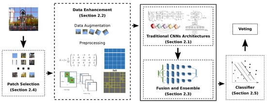 Data enhancement, including data augmentation and pre-processing, has been widely used as an effective way to improve the performance when dealing with computer vision tasks. These techniques have also been adopted for source camera identification schemes. Bondi et al. [,] normalized the images by subtracting the pixel-wise mean value, which is a popular way to center the data and helps the network to learn faster. Kamal et al. [] applied five different data augmentation operations: random crops, random rotations, image manipulations (including JPEG compression, gamma correlation, and resizing), images addition, and empirical mode decomposition. It should be noted that the authors increased the training set size by collecting more images from Flickr (https://www.flickr.com/). The results demonstrated that adding more images has a great impact to performance: considering that deep learning-based methods are data-driven, increasing the number of training examples definitely leads to higher detection accuracies. Team GPU_muscle [,] collected more than 500 GiB of photos from various resources (Flickr, Yandex.Fotki, Wikipedia Commons, mobile reviews, and others) and obtained an accuracy of more than by training traditional CNNs. In addition, using manipulated images such as enhanced images with gamma correction, JPEG compressed images, and images transformed by resampling operation, to some extent, enhances the robustness of the CNN model.