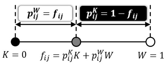 can be viewed as the occurrence probabilities of black and white because of and . In other words, the grayscale Neugebauer model expresses an arbitrary grayscale value as an internally dividing point between black (K) and white (W) as illustrated in Figure 2.