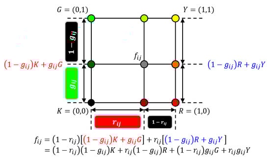 The grayscale Neugebauer model illustrated in Figure 2 has a one-dimensional structure, where a midpoint is expressed as a linear interpolant between K and W. This one-dimensional structure of grayscale Neugebauer model can be extended to two-dimensional bilinear interpolation as follows: Let be a two-dimensional color vector on an RG (red and green) color plane as illustrated in Figure 3. Then can be expressed as a bilinear interpolant of four basic colors: K (black), R (red), G (green) and Y (yellow) as shown in Figure 3, where a linear interpolant between K and G is expressed as for a given green value . Similarly, a linear interpolant between R and Y is expressed as . Using those expressions, on the RG color plane can be expressed as a linear interpolant of and for a given red value as follows: