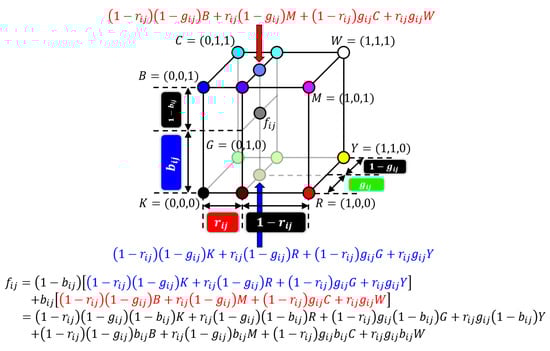 Let be a three-dimensional color vector in an RGB color space as shown in Figure 4. Then the orthogonal projection of onto the bottom plane of the RGB color cube is given by Equation (20) using two-dimensional Neugebauer model. Similarly, another orthogonal projection of onto the top plane of the RGB color cube is given by . On the contrary, can be represented as an interpolant of the above two orthogonal projections of as follows: